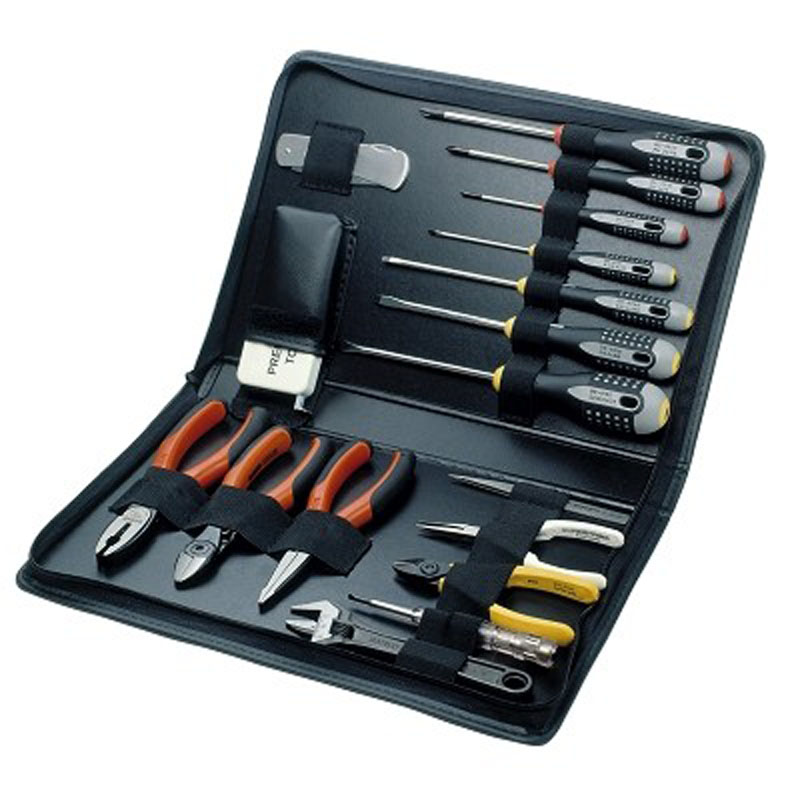 17teiliger Satz qualitativ hochwertiger Werkzeuge. Beinhaltet Seitenschneider und Zangen für Reparaturarbeiten sowie Präzisionsarbeiten, Schraubendreher, Pinzetten, Rollgabelschlüssel, Messer und Massband.