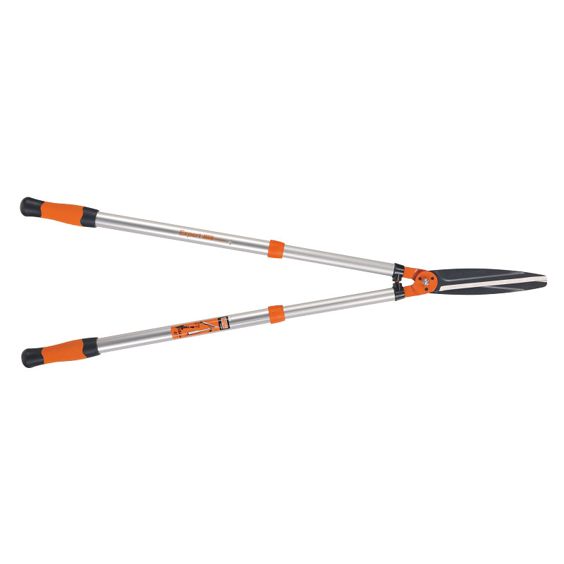 Sehr leichte Teleskop-Heckenschere mit silbernen Aluminium-Griffen, auf 79 -104 mm ausziehbar. Spezielles Verschluss-System verriegelt/entriegelt durch eine Vierteldrehung. Durchgehärtete Stahlklingen. Griffe aus Aluminiumrohr mit 2-Komponenten-Griffstücken. Gummipuffer für komfortables und ermüdungsfreies Arbeiten.