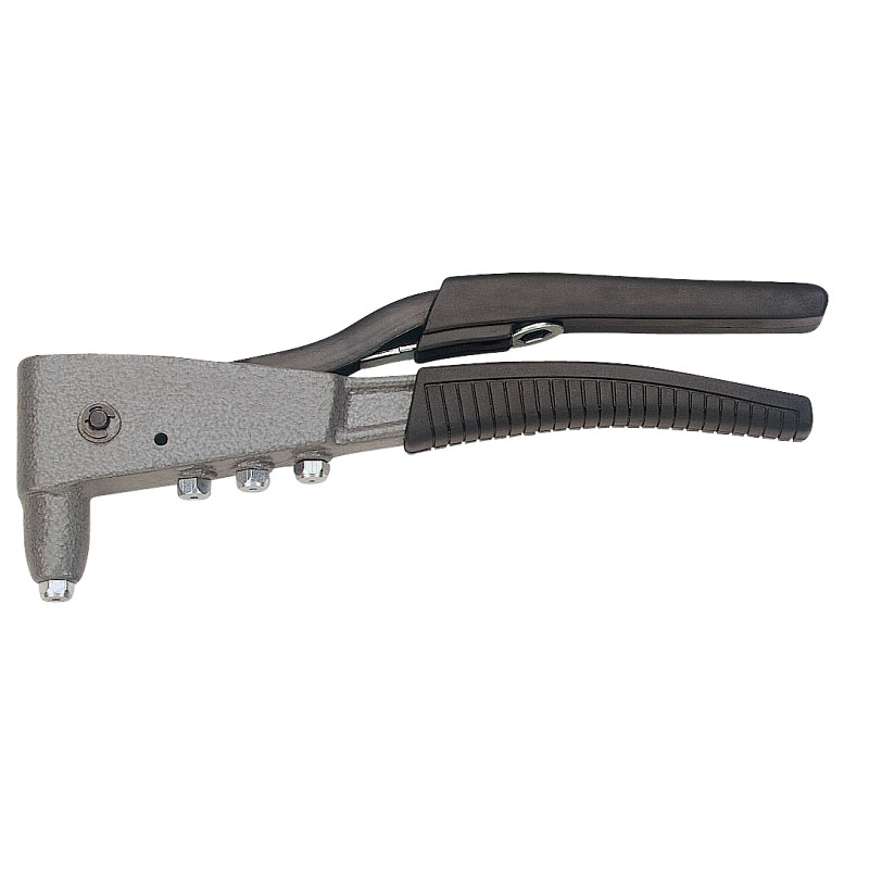 Universelle Handnietzange mit vier verschiedenen Wechselköpfen für Nieten mit 2,4mm; 3,2mm; 4,0mm und 4,8mm. Enthält einen Schlüssel für den Kopfwechsel.