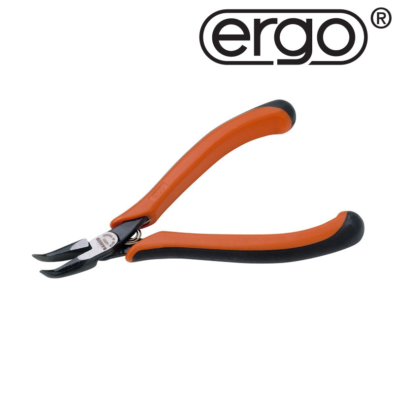 Flachrundzange 60° gewinkelt, mit glatten Greifflächen. Für Feinmechanik, Telekommunikation und Elektronik. Mit Öffnungsfeder. Backen computergeschliffen, dadurch höchste Präzision.