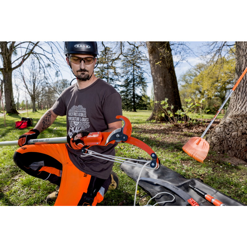 Profi-Raupenschere mit gehärteter, zweifach geschränkter Klinge. Die gestanzte und gehärtete Gegenklinge mit Saftablauf vermindert die Reibung zwischen den Klingen, ein Festklemmen wird so vermieden. Leichte Handhabung durch 3-fache Hebelwirkung mit Flaschenzug-Prinzip. Verstellbare Aufnahme zur Befestigung von (Teleskop-)Stielen mit 25 mm (1") bis 35 mm (1 3/8") Durchmesser. Verpackung beinhaltet ein 5 m langes Seil mit Griff.